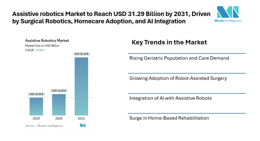 According to Mordor Intelligence, the assistive robotics market size is valued at USD 10.55 billion in 2025 and is projected to grow to USD 12.65 billion in 2026. Over the forecast period, the assistive robotics market forecast indicates that the market will reach USD 31.29 billion by 2031, expanding at a CAGR of 19.86%. The assistive robotics market growth is closely linked to demographic shifts, reimbursement reforms, and the practical need to manage long-term care efficiently. From hospital operating rooms to homecare environments, robots are moving beyond pilot projects into everyday healthcare workflows, strengthening the assistive robotics market share across regions.