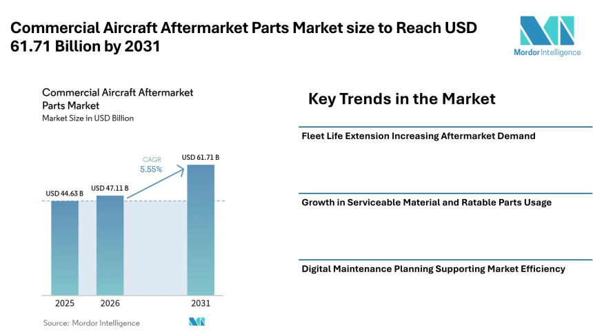 Reading: Commercial Aircraft Aftermarket Parts Market size to Reach USD 61.71 Billion by 2031 as Fleet Life Extension and Predictive Maintenance Influence Market Trends – Mordor Intelligence