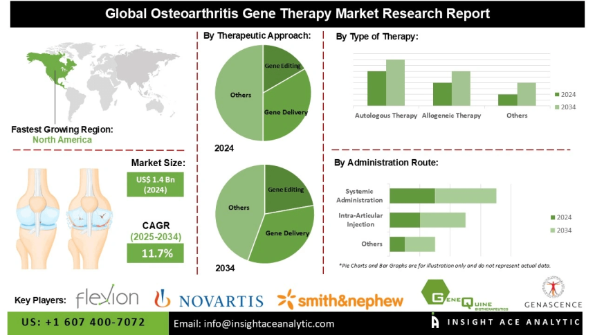 InsightAce Analytic Pvt. Ltd. announces the release of a market assessment report on the “Global Osteoarthritis Gene Therapy Market Size, Share & Trends Analysis Report By Therapeutic Approach (Gene Editing, Gene Delivery, Gene Regulation, Gene Silencing, Gene Replacement), By Type of Therapy (Autologous Therapy, Allogeneic Therapy), By Administration Route (Intra-Articular Injection, Systemic Administration, Local Administration), By Target Molecule (Cytokines, Growth Factors, Proteins, Enzymes, MicroRNAs),-Market Outlook And Industry Analysis 2034″