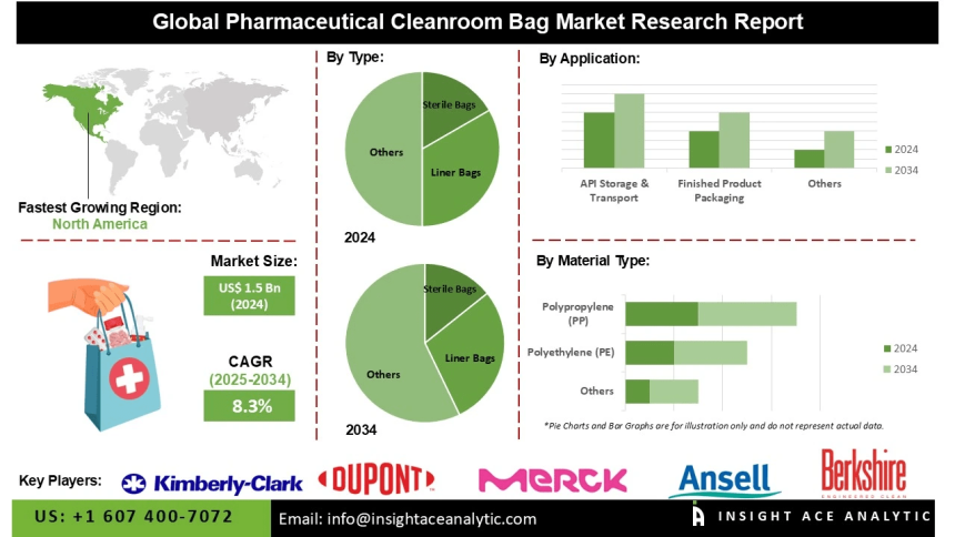 InsightAce Analytic Pvt. Ltd. announces the release of a market assessment report on the “Global Pharmaceutical Cleanroom Bag Market Size, Share & Trends Analysis Report By Type (Liner Bags, Sterile Bags, and Zipper Bags), By Material Type (Nylon, Polyethylene (PE), Polypropylene (PP), and Others), By Application (API Storage & Transport, Finished Product Packaging, Waste Disposal, and Equipment Covers),-Market Outlook And Industry Analysis 2034″