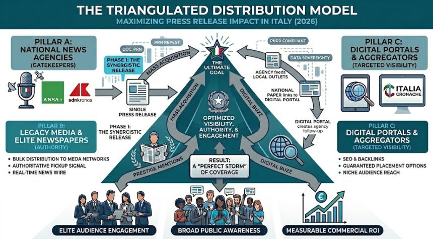 To succeed in 2026, the “broadcast” model of PR—sending one release to a thousand journalists—is considered obsolete. Today, the most successful Italian PR strategies utilize a Triangulated Distribution Model.