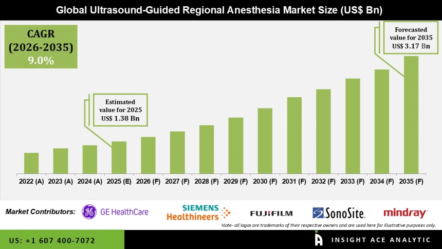 Ultrasound-Guided Regional Anesthesia Market Size is valued at USD 1.38 Bn in 2025 and is predicted to reach USD 3.17 Bn by the year 2035 at a 9.0% CAGR during the forecast period for 2026 to 2035..