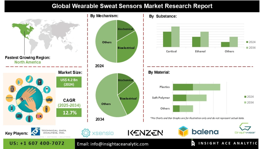 InsightAce Analytic Pvt. Ltd. announces the release of a market assessment report on the “Global Wearable Sweat Sensors Market Size, Share & Trends Analysis Report By Mechanism (Biochemical, and Bioelectrical), by Substance (Cortisol, Ethanol, and Others), By Material (Soft Polymer, Plastics, and Others)-Market Outlook And Industry Analysis 2034″